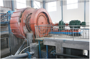 目前國內(nèi)的磨礦設(shè)備主要是球磨機。球磨機大體上是一個筒體結(jié)構(gòu),筒體可高達3.6米,臥于鋼架上,由傳動裝置帶動軸承讓筒體旋轉(zhuǎn),筒體內(nèi)裝有許多鋼球,一般鋼球量可占去筒體容量的40%~45%,重量常達數(shù)十噸。筒體的旋轉(zhuǎn)將鋼球帶到上部并任其向下拋落,形成沖擊力,將大塊礦石砸碎;鋼球同時在筒體的旋轉(zhuǎn)過程中互相作用,形成磨剝力,將被擊碎的礦物磨細。煙臺鑫海礦機公司則在礦物進入球磨機之前增加了一個工序,那就是先用超細層壓自磨機對礦物進行碾磨。它相當于一套中細碎篩分系統(tǒng)+1/2磨礦分組系統(tǒng),省略了中細碎篩分廠房和設(shè)備,是一種兼有中細碎和粗磨兩種功能的磨礦設(shè)備。