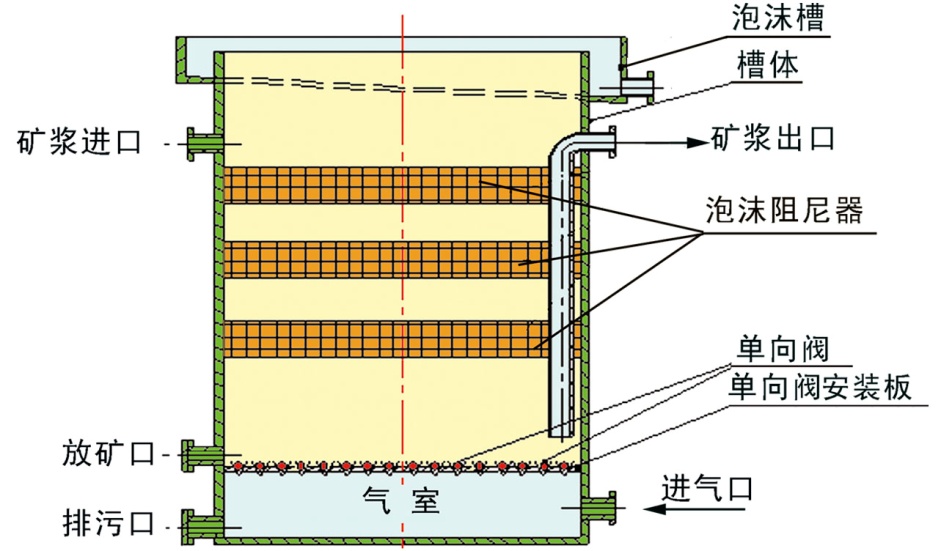 全截面氣升式微泡浮選機是一種在浮選機底部全截面均勻地密布安裝眾多彈性耐磨橡膠單向閥,單向閥閥孔較小,當壓入空氣是,產生大量的微泡。浮選機槽體較高,槽內設有礦漿阻尼裝置,延長了浮選時間和增加了礦粒、藥劑和空氣的附著機會,減少了小氣泡的團聚。同時因為大量帶有壓力的氣升空氣對礦漿起到了攪拌作用,所以浮選機的攪拌不需要另外的電動攪拌裝置,節能效果非常明顯。